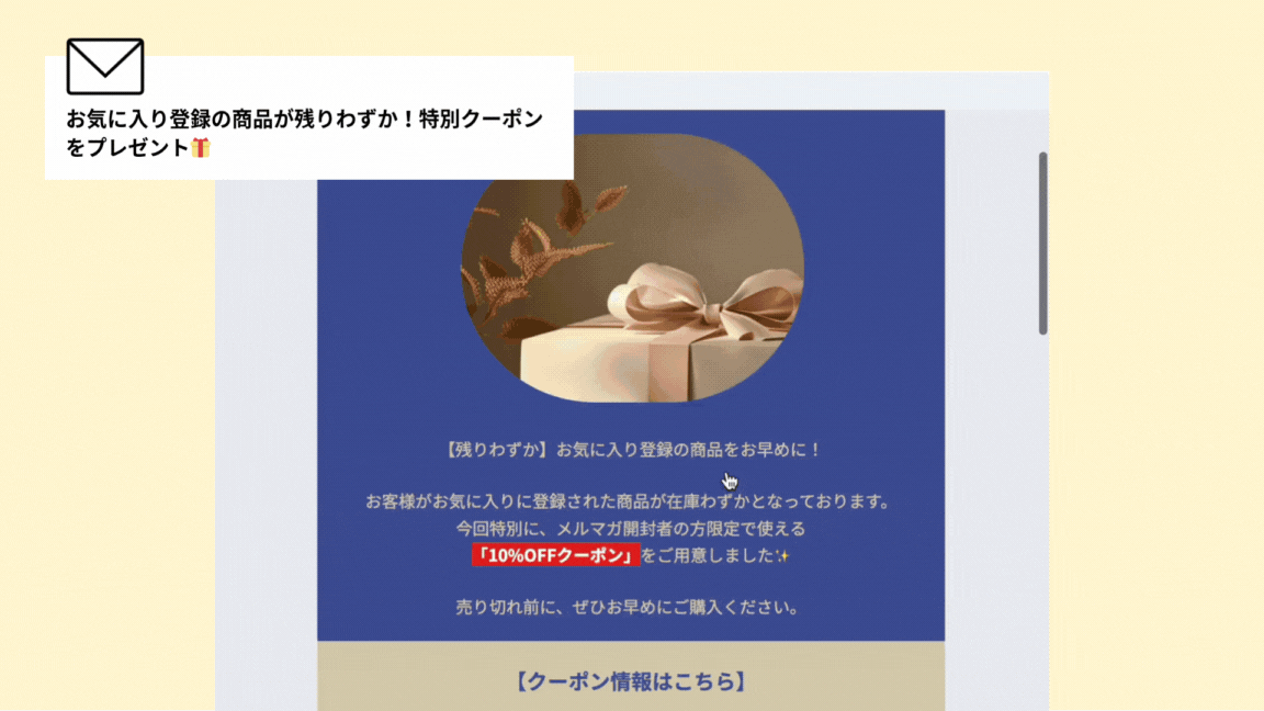 こちらのお客様に 「お気に入りの商品は在庫残り僅か」と知らせるメールを送信し、10%OFFのクーポンを同封。